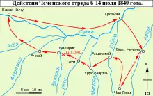An attempt to disarm the population of Chechnya in the spring of 1840 had caused unrest which grew into open rebellion against the Russian authorities. The Caucasus resistance leader, Imam Shamil, took this opportunity to appoint Ahberdila Muhammad as naib (governor) of Lesser Chechnya and call for a general uprising of the Karabulaks, Galashians, the Sunzha and Nadterechny Chechens,[2] Nazrans and Ghalghaï. The Russian authorities felt compelled to organize a military expedition against the rebels.[3] The Russian writer M. Lermontov also participated in the battle.