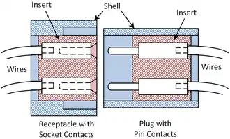 A connector whose shell fits inside the shell of the mating connector is called a plug, and the other connector is called a receptacle. The figure shows a plug with pin contacts and a receptacle with socket contacts, but the opposite arrangement is also common.