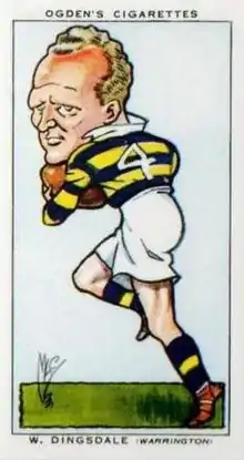 Billy Dingsdale won caps for England while at Warrington in 1928 against Wales, in 1929 against Other Nationalities, in 1930 against Wales, and Other Nationalities, in 1931 against Wales, in 1932 against Wales, in 1933 against Other Nationalities,[3] and won caps for Great Britain while at Warrington in 1929 against Australia (2 matches), and on the 1932 Great Britain Lions tour against Australia.[4]