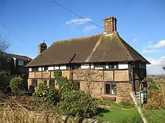 'Stockmans', on the corner at the north side of Blackstone Street, dates to possibly before the 17th century. It is of two storeys and three bays, the lower storey in red brick, the upper timber-framed with part brick and part plaster infill and a hipped roof.[9][10] Also at the north of the street, further east, is 'Blackstone Farmhouse', dating to the mid-18th century, of five bays in two storeys, and of red brick with a Horsham Stone tiled roof with chimneys at each end. There is an external '1674' datestone. Today the house is named by an external plaque as 'Blackstone House'.[1][11][12] At the east corner of the street is Yeomans Hall, possibly pre-17th century, and its attached former barn, 18th century, making a tiled roof L-shaped complex of two storeys with hipped roofs and casement windows. The hall is timber framed, with red brick infill on the north face, and includes an external chimney breast. The south side is completely red brick faced, the east with overlapping red tile facing above a brick plinth. The red brick faced 'barn' attached at right angles at the west is incorporated making a residential whole. In the early 17th century a parlour wing, service extensions, an upper floor and the external chimney stack were added to the hall.[1][13][14] On the south side of the street, opposite Yeomans Hall, is 'Corner Cottages', an 18th-century terraced range of four two-storey cottages with a shallow hipped roof. The cottages are of red brick laid in Sussex bond, three stretchers to one header. The windows in three of the cottages are sash but sliding horizontally.[15][16] On the same side of the street in the next plot is 'Old Timbers', possible dating to before the 17th century, of two storeys and three bays with casement windows. It is timber framed with white painted brick infilling below and white plaster above. the roof at the west is hipped, and at the east is truncated with an added lower lean-to.[17][18] Two further terraced ranges of cottages are on the north side of the east end of Blackstone street, both dating to the mid-19th century; one is timber-framed, the other with a facade of overlapping slate tiles.[1]
