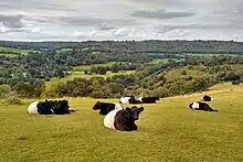 The soil covering the north- and south-facing chalk slopes of the hill is too thin and insufficiently fertile to allow cultivation. These areas are indicated as sheep-walk on the 1801 map and were used as pasture, especially during the winter months when lower ground was too wet for productive grazing.[34] Grazing of these slopes has continued into the 21st century and a herd of Belted Galloway cattle is used by both Surrey Wildlife Trust and the National Trust to control growth of grasses, thereby allowing wild flowers (including orchids) to flourish.[36][37]