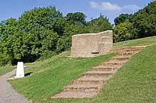 During World War II, the River Mole comprised part of the fortified GHQ Line B. This defensive line ran along the North Downs from Farnham via Guildford to Dorking, before following the river to Horley.[62] Between Betchworth and Box Hill, the north bank of the River Mole was stabilised and made steeper to prevent wheeled vehicles from crossing. At Boxhill Farm, where access to the river from the north bank was required for the herd of dairy cows, a row of twelve concrete cylinders were cast as an anti-tank measure. Gun mounts were also installed to protect both Boxhill and Deepdene bridges and several pillboxes were constructed.[62][63][64] The Stepping Stones at the foot of the hill were removed as an anti-invasion measure.[64]