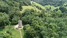 Box Hill is a summit of the North Downs in Surrey, approximately 31 km (19 mi) south-west of London. The hill gets its name from the ancient box woodland found on the steepest west-facing chalk slopes overlooking the River Mole. The western part of the hill is owned and managed by the National Trust, whilst the village of Box Hill lies on higher ground to the east. The highest point is Betchworth Clump at 224 m (735 ft) above OD,[1] although the Salomons Memorial (at 172 metres) overlooking the town of Dorking is the most popular viewpoint.[2]