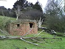The sites were purchased from the trustees of the Hope estate by the Ministry of Defence in 1891, and construction began in 1899.[56][58] The two centres were laid out in the form of infantry redoubts typical of the period, but also included magazines (partially below ground level) for the storage of shells and cartridges.[58][59] (In common with the majority of the eleven other mobilisation centres, the forts were designed for the use of the infantry only and the stored ammunition was intended for the use of mobile field artillery which would be deployed nearby as required.)[59] The main flat-roofed buildings were built in brick and reinforced concrete and were protected from artillery fire by crescent-shaped earth blast banks, surrounded by an outer ditch.[51]
