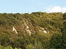 Chalk is a relatively soft rock that may be eroded or weathered in a number of different ways. It is porous, able to absorb up to 20% of its dry weight in water,[77] and therefore highly susceptible to weathering by freeze-thaw action, which may occur over repeated annual or diurnal cycles. This frost weathering produces a mix of rubble and viscous mud, which may be washed downhill, further eroding the landscape (a process known as solifluction).[78] At the west side of Box Hill, the hydraulic action of the River Mole has cut a cliff known as The Whites and the river bed contains coarse chalk rubble (clast), which has fallen from the steep slopes above.[78] Since the chalk contains a very high percentage of calcium carbonate, it can be dissolved by ground water and solubilisation of the rock at the base of the hill may have produced the slabwise slumping or subsidence visible at the top of the Burford Spur.[78] Finally, rainwater, which is mildly acidic, will dissolve and react with the chalk.[79]