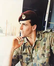 Greive joined the Australian Army after leaving high school and underwent training at the Royal Military College Duntroon in Canberra.[1] Whilst an undergraduate at RMC Duntroon, Greive undertook a military exchange with the Royal Thai Military Academy,[4][5] during which he toured Thai/Cambodian border military installations and refugee camps. Upon graduation as a commissioned officer (Lieutenant) Greive was posted to the 3rd Battalion of the Royal Australian Regiment (Para), and assumed command of 1st Platoon, Alpha Company – a paratroop combat rifle platoon. Greive's specialist combat qualifications include: Airborne Operations, Air Mobile Operations, Survival, Mine Warfare & Anti Handling Devices (Instructor), Heavy Weapons – Direct Fire Weapons, Anti-Armour, Heavy Machine Guns (Instructor).[6] He continued to serve in this capacity until 1993, when he left the military due to a tropical respiratory infection that led to asthma.[7]