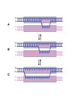 Branch migration is the process by which base pairs on homologous DNA strands are consecutively exchanged at a Holliday junction, moving the branch point up or down the DNA sequence.[1] Branch migration is the second step of genetic recombination, following the exchange of two single strands of DNA between two homologous chromosomes.[2] The process is random, and the branch point can be displaced in either direction on the strand, influencing the degree of which the genetic material is exchanged.[1] Branch migration can also be seen in DNA repair and replication, when filling in gaps in the sequence. It can also be seen when a foreign piece of DNA invades the strand.[2]