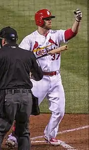 On July 30, 2015, the Indians traded Moss to the St. Louis Cardinals in exchange for minor league pitcher Rob Kaminsky.[21] He collected his first hit with the Cardinals, a single, on August 1 in a 6–2 loss to the Colorado Rockies.[22] His first RBI for the club occurred the next day, also against the Rockies, a game-winning single to score Jason Heyward in the bottom of the ninth inning.[23] He hit his first home run as a Cardinal on August 27 in the top of the fifth against the Arizona Diamondbacks. On September 1, Moss hit a three-run, walk-off home run against the Washington Nationals at Busch Stadium for an 8–5 win.[24] He combined to hit 19 home runs and 58 RBI with Cleveland and St. Louis in 2015.[25]