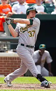 In 2012, Moss teamed up with Chris Carter for a first base platoon. He posted a .291/.358/.596 line with 21 home runs, which was third on the team behind Cespedes (23 home runs) and Josh Reddick (32 home runs), in 265 at-bats. On April 30, 2013, Los Angeles Angels relief pitcher Barry Enright surrendered a two-run walk-off home run to Moss in the nineteenth inning. The home run (Moss' second of the night), which ended the longest game in Athletics history, took place over six and a half hours after the first pitch, which was thrown by the Athletics' Dan Straily 7:05PM PT the previous day.[17] Moss had an overall good 2013 season hitting .256 with 30 homers and 87 RBI.[10]