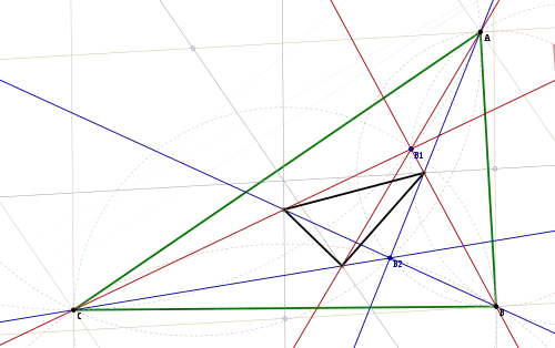 The Brocard triangle (in black) of the triangle ABC. B1 and B2 are the two Brocard points.