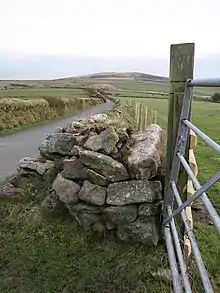 At its foot lies Browngelly Downs, and the area has preserved various remains of hut circles, barrows and cairns.[3] Five cairns are located in a semi-circular arc along the ridge of Brown Gelly. They are prominent from a distance and Christopher Tilley suggests they were intended to be seen as a group from the west and the east in order to "analogically resemble or simulate tors".[4] The tor is made of a granitic rock that has less autogenic alteration than other areas of Bodmin Moor due to some type of local anomaly.[5] Archaeological aerial reconnaissance was carried out over the area in the 1980s which suggested the remains of a prehistoric settlement comprising several dispersed hut circles.[6] These structures have also been called a "barrow group" by John Barnatt[7] Evidence of flint production and tin streaming has also been found in the area that supports the suggestion of an ancient settlement.[8]