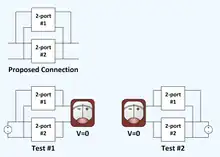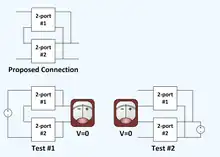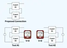 To check if two two-port networks can be connected in a parallel-parallel configuration, first of all just the input ports are connected in parallel, a voltage is applied to the input and the open-circuit voltage is measured/calculated between the outputs that are short-circuited each. If there is a voltage drop, the two-port networks cannot be combined in parallel. The same test is repeated from the output side of the two-port networks (parallel connection of the output ports, application of a voltage to the output, measurement/calculation of the open-circuit voltage between the inputs that are short-circuited each). Only if there is no voltage drop in both cases, a combination of the two-ports networks is permissible.