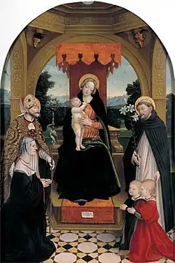 The Buronzo Altarpiece is a 1514 tempera on panel painting by Gerolamo Giovenone, now in the Galleria Sabauda in Turin, to which it was given in 1836, only a few years after the gallery opened.[1] It shows the Madonna and Child with Saints Abundius and Dominic presenting the work's commissioner Ludovica Buronzo and her sons Pietro and Gerolamo. It is signed and dated by the artist on a small scroll on the base of the throne. It was produced for the Sant'Abbondio chapel in San Paolo church in Vercelli, later passing onto the art market.[2]