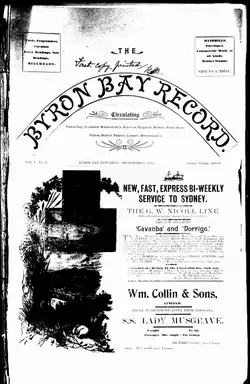 ![]() The front page of The Byron Bay Record Volume 1, Number 1 – 6 September 1902 | |