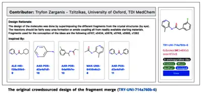 The design submissions were stored in Collaborative Drug Discovery's CDD Vault, a database used for large-scale management of chemical structures, experimental protocols and experimental results.[4] Alpha Lee and Matt Robinson brought computational expertise from PostEra to the project. PostEra used techniques from artificial intelligence and machine learning to develop analysis tools for computational drug discovery, chemical synthesis and biochemical assays. When COVID Moonshot's appeal resulted in not hundreds but thousands of responses, they built a platform capable of triaging large numbers of compounds and designing routes for their synthetic formation.[4]
