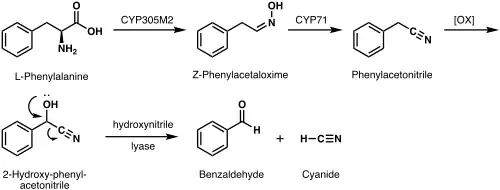 Biosynthesis of phenylacetonitrile catalyzed by CYP305M2 and subsequent decomposition to benzaldehyde and cyanide