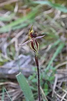 Caladenia actensis, commonly known as the Canberra spider orchid,[2] is a plant in the orchid family Orchidaceae and is endemic to the Australian Capital Territory. It has a single leaf and usually only one greenish flower with red markings and only occurs in three small populations.