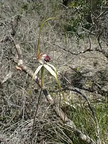 Caladenia excelsa is a terrestrial, perennial, deciduous, herb with an underground tuber and a single erect, hairy leaf, 200–350 mm (8–10 in) long and 6–12 mm (0.2–0.5 in) wide. One or two cream-coloured to greenish-cream flowers 150–300 mm (6–10 in) long and 70–150 mm (3–6 in) wide are borne on a stalk 450–900 mm (20–40 in) tall. The sepals and petals have long, brownish, drooping thread-like tips. The dorsal sepal curves backwards behind the flower, 130–200 mm (5–8 in) long and 3–5 mm (0.1–0.2 in) wide at the base. The lateral sepals are 130–200 mm (5–8 in) long and 5–7 mm (0.2–0.3 in) wide at the base and taper to long, thin tips. The petals are 95–150 mm (4–6 in) long, 3–5 mm (0.1–0.2 in) wide at their bases and taper like the lateral sepals. The labellum is creamy-coloured with a red tip, 25–35 mm (0.98–1.4 in) long, 12–17 mm (0.5–0.7 in) wide and has many thin teeth up to 10 mm (0.4 in) long on its sides. There are four rows of maroon or white calli along the centre line of the labellum. Flowering occurs from late September to early November.[2][3][4]