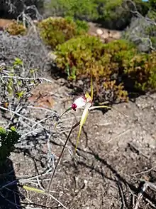 The granite spider orchid occurs between Mount Manypeaks and Cheyne Beach in the Waychinicup National Park where it grows in heath on coastal granite outcrops.[2][3][4][6][7]