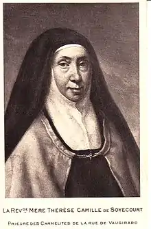 Camille de Soyécourt (1757–1849) or Thérèse Camille de l'Enfant-Jésus was a French Catholic nun who restored the Discalced Carmelite Order in France after the French Revolution.