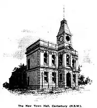 The Canterbury Town Hall was an Australian municipal town hall located at 322 Canterbury Road in Canterbury, a suburb in the Inner West of Sydney, New South Wales. It was built in 1889 in the Victorian Free Classical architectural style by architect W. H. Monckton, and was officially opened on 11 April 1889 by the Prime Minister of New South Wales, Sir Henry Parkes. The Town Hall was the seat of Canterbury Municipal Council from 1889 to 1963. When the council moved to a new purpose-built administration centre on Beamish Street in Campsie, a recognition of the change in economic importance of Campsie, the town hall was quickly disposed of by Council and demolished, being replaced by a service station. Today the Town Hall site is part derelict and part paint shop.