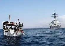 On 9 May, while operating with Combined Task Force 150, the destroyer Shoup assisted a disabled dhow Dunia by towing it (pictured) from the Gulf of Aden to Mukalla, Yemen.[57] Carrier Strike Group Nine also paid two port visit to Jebel Ali, United Arab Emirates (UAE), during its 2008 deployment with the U.S. Fifth Fleet.[58]