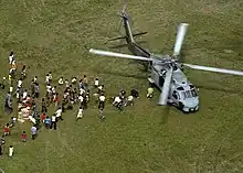 On 26 December 2004, a massive submerged earthquake and ensuing tsunami waves swept across the Indian Ocean basin, causing widespread devastation and killing over 230,000 people in fourteen countries. The military element of humanitarian and relief effort was designated Operation Unified Assistance under the direction of Combined Support Force 536 (CSF-536). On 28 December 2004, Carrier Strike Group Nine set sail from Hong Kong and arrived off the coast of Indonesia near Banda Aceh, Sumatra, on 1 January 2005.[1] Rear Admiral William D. Crowder, was designated as commander, Combined Support Group Indonesia, as part of CSF-536.[4] Abraham Lincoln's Air Transportation Office coordinated the flow of supplies into the region, and the carrier provided air traffic control for the relief effort.[5][6] SH-60 helicopters Seahawks from squadrons HSL-47 and HS-2 ferried supplies from collection points in Sumatra for trans-shipment to disaster victims in the vicinity. The intensive nature of the support missions drove the Seahawks to log over 1,000 hours, more than three times the expected wear-and-tear of standard deployments.[1] HSL-47 itself logged over 600 hours during the month of January 2005.[7] Strike group ships, such as the destroyer Benfold, served as re-fueling stations for helicopters involved in relief efforts. Benfold provided 155 gallons (586.7 liters) of fuel a day, accounting for more than 14,500 gallons (54,888.47 liters) of fuel since this disaster relief operation began.[8] Benfold also served as a mothership for Naval Oceanographic Office team conducting safety of navigation surveys of the altered Indonesian coastlines that had been affected by the tsunami at the request of the Indonesian government.[9] The fast combat support ship Rainier provided underway replenishment support to 32 American, British, and Australian warships involved in Operation Unified Assistance.[10] Also, sailors and Marines from Carrier Strike Group Nine went ashore to provide humanitarian assistance.[11] Sailors from the Abraham Lincoln's Engineering Department Repair Division designed a potable water manifold to help bring fresh water to Aceh Province, Sumatra, with the system beginning to ship the much-needed fresh water on 4 January.[12] Also, teams from the strike group, including the destroyer Benfold, flew into Banda Aceh daily to work at the Sultan IskandarMuda Air Force Base to unload humanitarian aid from trucks to waiting helicopters that deliver the aid to survivors in remote locations.[13]