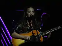 Lovato was discovered by the Disney Channel during an open call audition in her hometown of Dallas, Texas and made her debut on the short series As the Bell Rings in 2007.[8] She subsequently auditioned for a role on the television series Jonas, but did not get the part.[8] Instead, she received the main role in the television film Camp Rock after singing for the network executives.[8] Later, she auditioned for a role on the series Sonny with a Chance, which she also received.[9] Lovato enlisted the Jonas Brothers, her Camp Rock co-stars, to work with them on her debut studio album, Don't Forget (2008). The writing began during filming of Camp Rock in 2007 and continued on the band's Look Me in the Eyes Tour in 2008.[9][10] Lovato wanted to establish herself as a musician with the album, and not being known as just "the person from Camp Rock."[9] She said that her goal was to have fun on the album and that she would tackle deeper themes in her sophomore effort.[11]