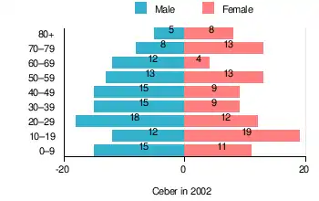 According to the 2002 Poland census, there were 211 people residing in Ceber village, of whom 53.6% were male and 46.4% were female. In the village, the population was spread out, with 23.7% under the age of 18, 32.7% from 18 to 44, 22.3% from 45 to 64, and 21.3% who were 65 years of age or older.[1]