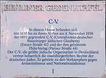 In 1928 the "Büro Wilhelmstrasse" (Wilhelmstrasse Office) was created with the instrumental support of Alfred Wiener. It documented Nazi activities and issued anti-Nazi materials until 1933, when Hitler came to power.[2] During the Nazi era, the CV was forced to change its name several times. From 1936 onwards it was called "Jüdischer Central Verein" (Jewish Central Association).[3] After the Kristallnacht (Night of Broken Glass or November Pogrom) in 1938 the CV had to stop publishing its newspaper and the association was prohibited a short time later.
