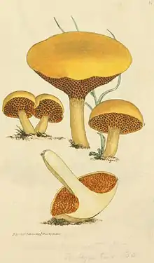 French mycologist Pierre Bulliard described the species as Boletus piperatus in 1790.[2] In its taxonomic history, it has been transferred to the genera Leccinum (Samuel Frederick Gray, 1821), Viscipellis (Lucien Quélet, 1886), Ixocomus (Quélet, 1888), Suillus (Otto Kuntze, 1898), and Ceriomyces (William Alphonso Murrill, 1909).[1] It was reclassified and given its current binomial name in 1908 by Frédéric Bataille when he made it the type species of the newly circumscribed genus Chalciporus.[3] The species name piperatus means "peppery" in Latin.[4] It is commonly known as the "peppery bolete".[5]