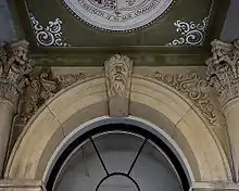 "a vast amount of stone cutting has been accomplished .... The carvings on the spandrels of the chief entrance are exceedingly fine. They comprise the national emblems of the three United Kingdoms - the rose, the thistle, and the shamrock disposed on either side by an ancient lyre. These carvings together with the fine bearded face which forms the keystone of the arch [see photo above] are the work of Mr Thomas, contractor for the stone cutting and they certainly do him very great credit".