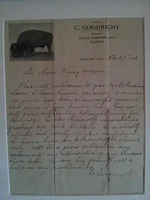 Charles Goodnight (March 5, 1836 – December 12, 1929), also known as Charlie Goodnight, was a rancher in the American West.[1] In 1955, he was inducted into the Hall of Great Westerners of the National Cowboy & Western Heritage Museum.[2]