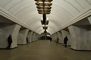 Chekhovskaya (Russian: Чеховская) is a station of the Serpukhovsko-Timiryazevskaya Line of the Moscow Metro. It was opened on December 31, 1987, and served as the northern terminus of the line for the following year. Its depth is 62 metres (203 ft). The vestibule is located in Pushkinskaya Square, while the station is named for the writer Anton Chekhov. It was the deepest station in Moscow Metro from 1987 until 1991.