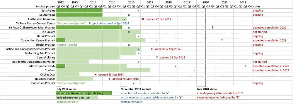 The timeline graphic is based on the indicative project delivery schedule contained in the Blueprint published in July 2012,[63] a pamphlet published in November 2014[64] plus the status as of July 2020. None of the projects were delivered as per the originally published indicative project delivery schedule.[65] The first project to be completed was Hagley Oval (September 2014). The original schedule saw all projects where a delivery date had been specified completed by March 2017; at that point in time just three of the seventeen projects had been completed (the Bus Interchange was the second project (May 2015) to be finished, and the Earthquake Memorial the third project in February 2017).[65] Ngāi Tahu abandoned its anchor project—Te Puna Ahurea Cultural Centre—in April 2014.[9] As of July 2020, neither the Square, the Residential Demonstration Project, nor the stadium have been started, and only the stadium has a confirmed project status.