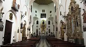 A new church building was constructed in the 16th century to replace the mosque structure.[8] Initially, in the first decades following its consecration, the building was expanded with the addition of new rooms and of a new lateral entrance.[7] The new entrance portal was completed in 1543 by Esteban Sánchez under the direciton of Diego Siloe.[7] In 1565, work began on replacing the old building entirely. First built was the chancel, which was completed in 1592. It was designed by architect Juan de la Maeda, a student of Siloe, and executed by stonemasons Juan Martínez (up to 1576) and Juan de la Vega (after 1576).[7] The church's bell tower was also completed around 1592 and is attributed to architect Ambrosio de Vico.[7] By the end of the century, the rest of the mosque was demolished and work on the new nave was carried out around 1610. The northwestern portal, leading to the cloister, also dates from the 17th century.[7] Construction work was slowed considerably by the economic devastation caused by the Morisco rebellion of 1568 and the subsequent expulsion of the Moriscos from Granada, which depleted the neighbourhood's population (which was largely composed of Moriscos until then). This also caused the building itself to be completed with a less ambitious architectural design than initially envisioned.[7]