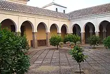 Prior to the current church, the site was occupied by the Great Mosque of the Albaicin (Arabic: مسجد الجامع البيازين, romanized: Masjid al-Jāmi' al-Bayyāzīn).[4] The mosque was built in the 13th century under Almohad rule.[5][4] Only its courtyard (sahn), with arcades of horseshoe arches, has been preserved today as part of the church. The mosque originally covered a total area measuring 42.4 by 32.2 metres.[6] Its prayer hall, now disappeared, had a hypostyle form similar to the city's larger Great Mosque on the site of the current Cathedral. It had 9 aisles divided by rows of arches supported by 86 marble columns, with the central aisle being wider than the others. The courtyard was planted with lemon trees. Across the street from the mosque, there originally stood an Islamic primary school and a khan (urban caravanserai).[6]