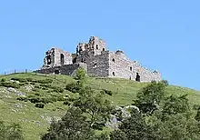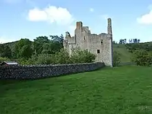 - Glenbuchat Castle, four miles west of Kildrummy, Aberdeenshire, dates from 1590.[7] It was seized by James VI of Scotland during Huntly's rising of 1594.[7] Brigadier-General John Gordon of Glenbuchat fought for the Jacobites in both the risings of 1715 and 1745, leading the Gordons and Farquharsons at the Battle of Culloden.[7] He escaped to Norway and died in France.[7] The castle was a ruin by 1738 and was sold to the Duff Earl of Fife.[7] It was then replaced with Glenbuchat House and the old castle is now in the care of Historic Scotland.[7]