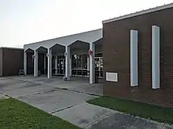 The Clay County Courthouse, Eastern District is located at Courthouse Square in the center of Piggott, one of two county seats of Clay County, Arkansas (the other is Corning). It is a single-story masonry structure, built out of concrete with brick facing. The main facade is symmetrical, with a recessed entrance area sheltered by a portico with a zigzag roof. The courthouse was built in 1966–67 to a design by Donnellan & Porterfield, replacing an 1890s Romanesque courthouse designed by Charles L. Thompson. Both this courthouse and that in Corning were built in the wake of a fire which destroyed the old Corning courthouse, and both were designed by Donnellan & Porterfield. Both are locally prominent examples of New Formalism style of Modern architecture.[2]