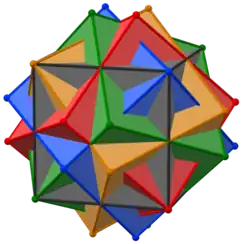 The eight vertices on the 3-fold symmetry axes can be seen as the vertices of a fifth cube of the same size.[3] Referring to the images below, the four old cubes are called colored, and the new one black. Each colored cube has two opposite vertices on a 3-fold symmetry axis, which are shared with the black cube. (In the picture both 3-fold vertices of the green cube are visible.) The remaining six vertices of each colored cube correspond to the faces of the black cube. This compound shares these properties with the compound of five cubes (related to the dodecahedron), into which it can be transformed by rotating the colored cubes on their 3-fold axes.