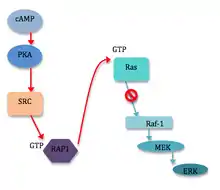 ERK, a participating protein in the MAPK signaling pathway, can be activated or inhibited by cAMP.[5] cAMP can inhibit ERKs in a variety of ways, most of which involve the cAMP-dependent protein kinase (PKA) and the inhibition of Ras-dependent signals to Raf-1.[6] However, cAMP can also stimulate cell proliferation by stimulating ERKs. This occurs through the induction of specific genes via phosphorylation of the transcription factor CREB by PKA.[5] Though ERKs do not appear to be a requirement for this phosphorylation of CREB, the MAPK pathway does play into crosstalk again, as ERKs are required to phosphorylate proteins downstream of CREB.[5] Other known examples of the requirement of ERKs for cAMP-induced transcriptional effects include induction of the prolactin gene in pituitary cells, and of the dopamine beta-hydroxylate gene in pheochromocytomal cells (PC12).[6] A number of diverse mechanisms exist by which cAMP can influence ERK signaling. Most mechanisms involving cAMP inhibition of ERKs uncouple Raf-1 from Ras activation through direct interaction of PKA with Raf-1 or indirectly through PKA interaction with the GTPase Rap1 [6] (see figure 1). PKA may also negatively regulate ERKs by the activation of PTPases. Mechanisms for the activation of ERKs by cAMP are even more varied, usually including Rap1 or Ras, and even cAMP directly.[6]