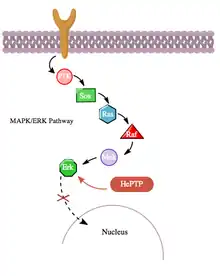 Phosphorylation of this third site by PKAs from the cAMP pathway inhibits binding of MAP kinases to HePTP and thereby upregulates the MAPK/ERK signaling cascade. The MAPK pathway, through Ras, Raf, Mek, and Erk, shows low activity in the presence of unphosphorylated (active) HePTP. However, activation the cAMP pathway stimulates the activation of PKA, which in turn phosphorylates HePTP at Ser23. This prevents HePTP from binding to Erk and frees the MAPK pathway from inhibition, allowing downstream signaling to continue (see figure 4).