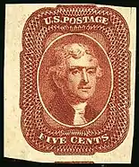On August 19, 1861, while the American Civil War was wreaking havoc across Virginia and elsewhere, the Post Office issued a 5-cent buff (yellow-brown) colored stamp that honored Thomas Jefferson. The engraving used to produce the image was modeled after a portrait by Gilbert Stuart. The engraver for this issue was William Marshall, who also engraved Washington's image for several issues of this period.[5] This Jefferson issue occurs in several distinct shades of brown. This image was again reprinted on February 3, 1863 in a dark brown color.[6] Also in 1861, Jefferson became the first U.S. president to appear on a Confederate stamp: a 10¢ value in blue, reissued in 1862 with its color changed to rose-pink.