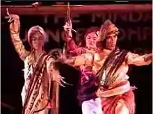 Then there are the songs, which the Yakan sing during daily activities. In keeping watch over rice fields, they sing some forms of the jamiluddin and kalangan. While resting at home, they also leisurely sing the katakata, jamiluddin, and nahana. Children at play imitate the adults in singing the kalangan, jamiluddin, lembukayu, and lugu (Nicolas 1977:97–100). One popular Yakan dance adopted from the Tausugs Pangalay is called mangalay. The dance is accompanied by the kunlintangan kayu and played by three people. In the Yakan "bumblebee" mimetic dance usually performed by a male dancer, a searcher successfully finds honey with the aid of a torch. He overeats, and the result is a stomachache (Orosa-Goquingco 1980:175). Another example of a mimetic dance is the tahing baila, which imitates the movement of a fish (Tiongson 1991:236). At weddings, the tumahik or war dance is to be performed by the groom as well as male relatives of both the groom and the bride. Dressed in Yakan finery, the dancer uses a spear and a shield to fight an imaginary enemy to the music of the kulintangan.