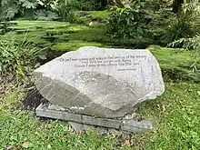 Dylan Thomas died in New York on 9 November 1953, aged 39.[14] A memorial stone, inscribed with lines from his poem 'Fern Hill', was placed in Cwmdonkin Park to mark the ten-year anniversary of his death on 9 November 1963.[15][16] The stone originally came from Cwmrhydyceirw Quarry in the north of the city, where it was picked out by Dylan's friend Vernon Watkins and the sculptor Ronald Cour. Watkins wrote two poems inspired by the choosing of his friend's memorial stone: 'At Cwmrhydyceirw Quarry' and 'Cwmrhydyceirw Elegaics'.[17] The inscription on the stone later became obscured by moss and erosion, before being restored in 2018.[16]