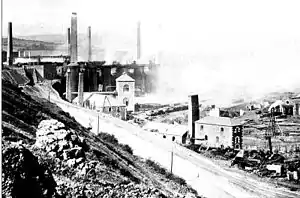 The Cyfarthfa works were begun in 1765 by Anthony Bacon (by then a merchant in London), who in that year with William Brownrigg, a fellow native of Whitehaven, Cumberland, leased the right to mine in a tract of 4,000 acres (16 km2) land on the west side of the river Taff at Merthyr Tydfil.[1] They employed Brownrigg's brother-in-law Charles Wood to build a forge there, to use the potting and stamping process, for which he and his brother had a patent. This was powered by water from the river, the race dividing into six to power a clay mill (for making the pots), two stampers, two helve hammers and a chafery. The construction of the first coke blast furnace began in August 1766. This was intended to be 50 feet high with cast iron blowing cylinders, rather than the traditional bellows. It was probably brought into blast in autumn 1767.[2] In the meantime, Plymouth ironworks was leased to provide pig iron for the forge.[3]