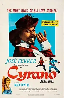 Cyrano de Bergerac is a 1950 American adventure comedy film based on the 1897 French Alexandrin verse drama Cyrano de Bergerac by Edmond Rostand. It uses poet Brian Hooker's 1923 English blank verse translation as the basis for its screenplay.[3] The film was the first motion picture version in English of Rostand's play, though there were several earlier adaptations in different languages.