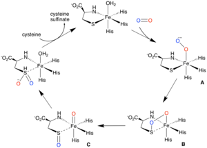 One proposed mechanism, supported by computational and spectroscopic studies, involves O2 binding cis to a thiolate to form reactive iron (III)-superoxo species (A), which then attacks the bound sulfur of cysteine to form a four-membered ring structure (B).[10][11][12] Heterolytic O-O bond cleavage then affords a high-valent iron (IV) oxo intermediate (C), which transfers the second oxygen to sulfur.[10][11]