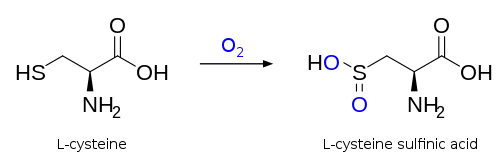 - CDO reaction scheme showing cysteine sulfinic acid formation from cysteine by dioxygen incorporation