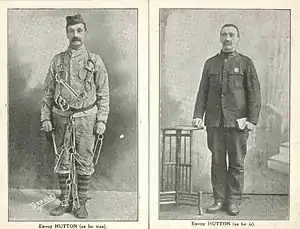 Hutton became a 'Special' for the Salvation Army, an evangelist and preacher who travelled the country by invitation to speak at meetings and tell the story of his life. By special permission of the Home Secretary Herbert Gladstone Hutton would wear his prison clothes, chains and leg irons to lead Salvation Army meetings.[4][6]